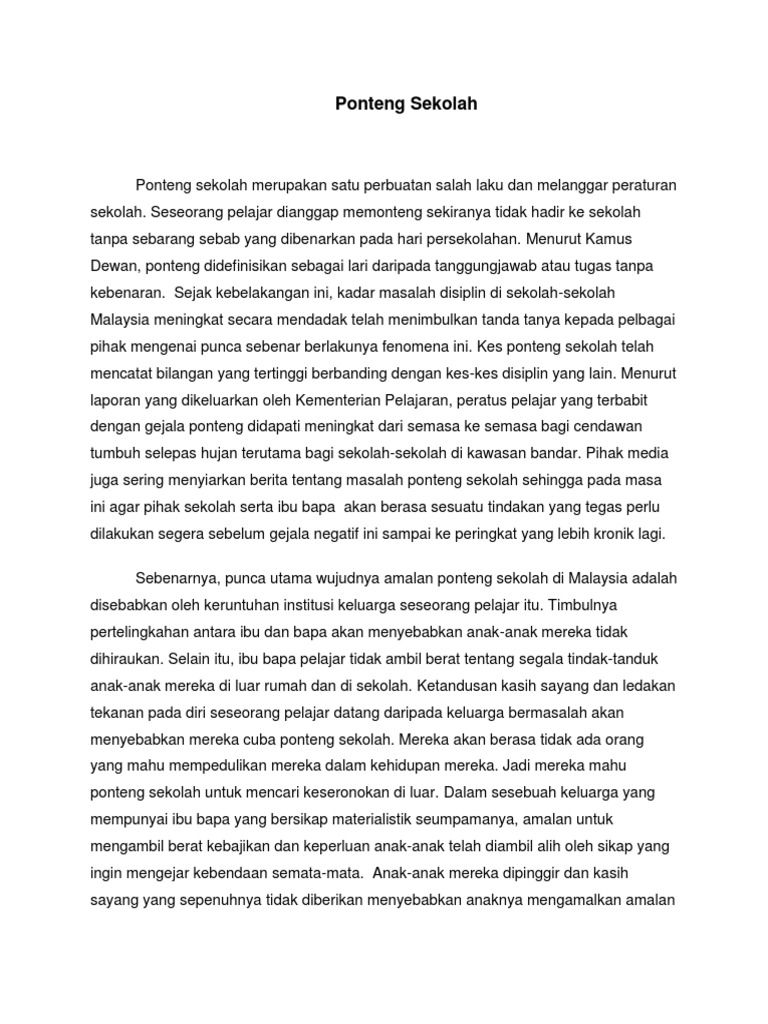 Semoga perkongsian bahan-bahan rujukan panduan bahan pembelajaran dan pengajaran contoh-contoh karangan sumber rujukan SPM Sijil Pelajaran Malaysia tingkatan. Jika tidak gejala ponteng sekolah akan mencetuskan pelbagai masalah lain yang lebih buruk kesannya kerana kudis akan menjadi tokak jika tidak diubati. Ibu Bapa memantau pergerakan anak.